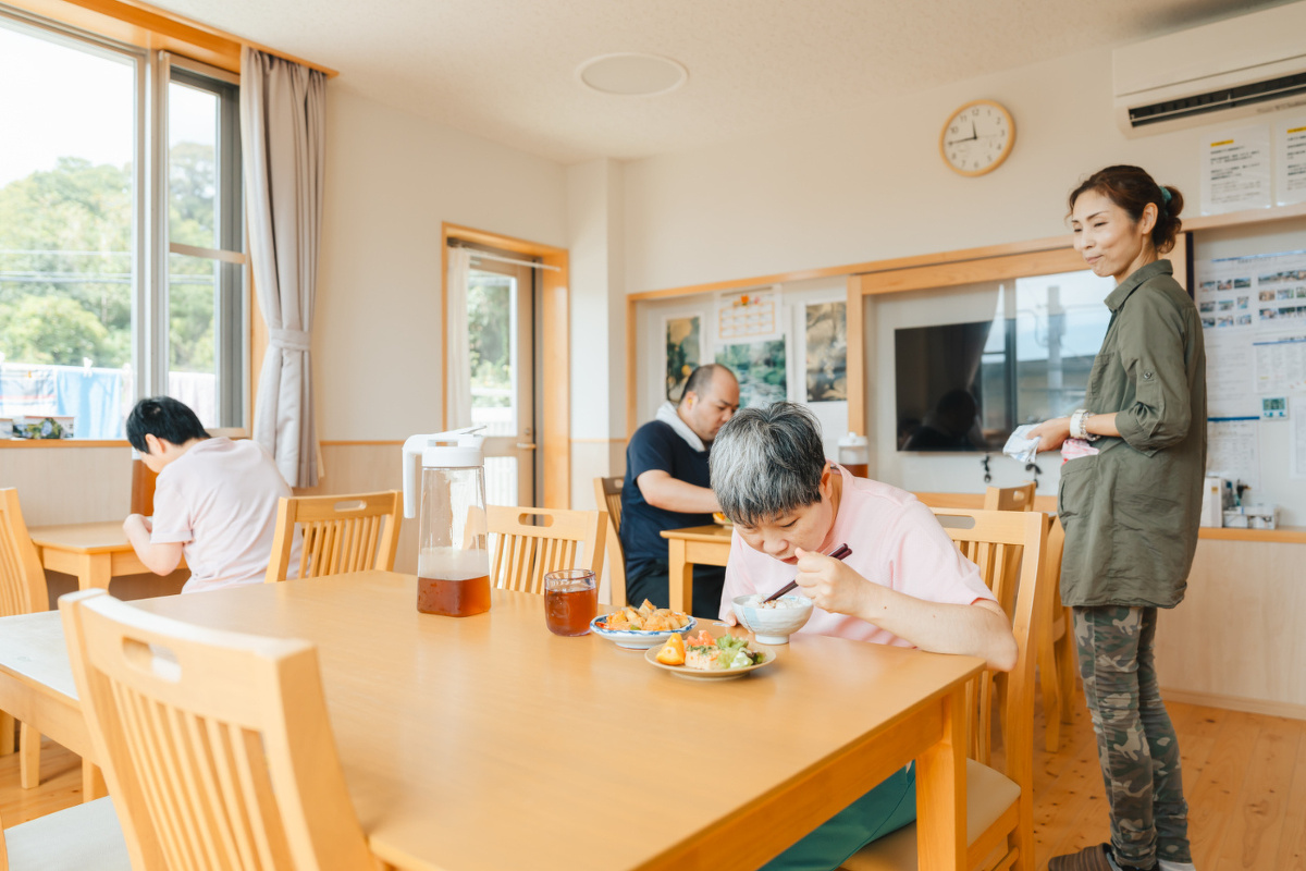 A 職員の昼食は利用者と一緒にとります。そのため、昼食時に見守りや支援が必要となる場合があります。一部の職員にとって負担を感じることがあるかもしれませんが、チームでのローテーションを取り入れるなどして休憩時間を確保できるよう工夫しています。 |