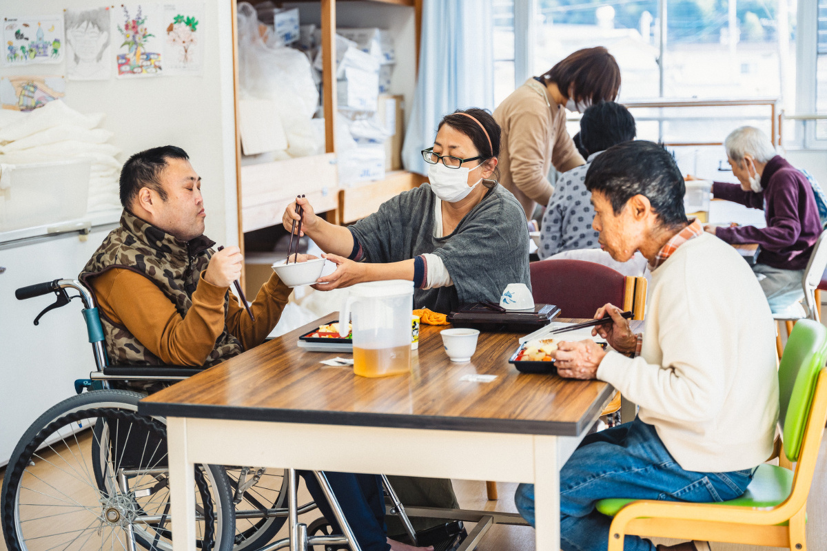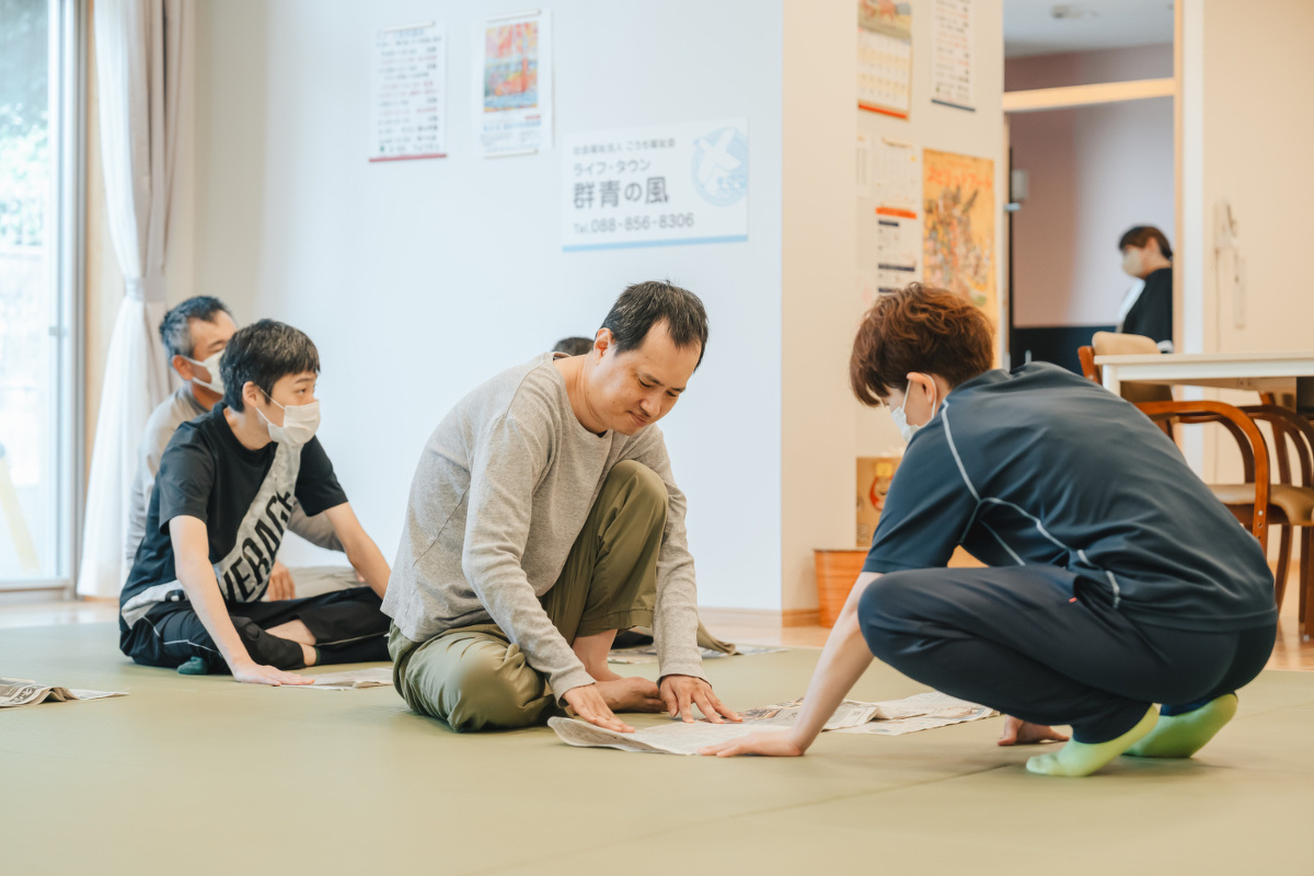 こうち福祉会では、利用者さんの心とからだの健康の維持を目的に、さまざまな日中活動(レクリエーション)を積極的に取り入れています。毎朝の散歩からはじまり、お花見やクリスマス会など季節ごとのイベント、月に1〜4回程度行う「あおぞら体操」や「いきいき体操」、さらに、歌うことが大好きな利用者さんが多いので歌の時間なども設けています。活動の計画にあたっては、いつも楽しい気持ちで参加していただけるよう、月に1回利用者さんの「したいこと」を集約するあおぞら会を実施し、みなさんの気持ちを大切にしています。また、春野町に新設した「春乃群青」では、入浴や創作活動に力を入れており、日々にさらなる彩りを加えています。